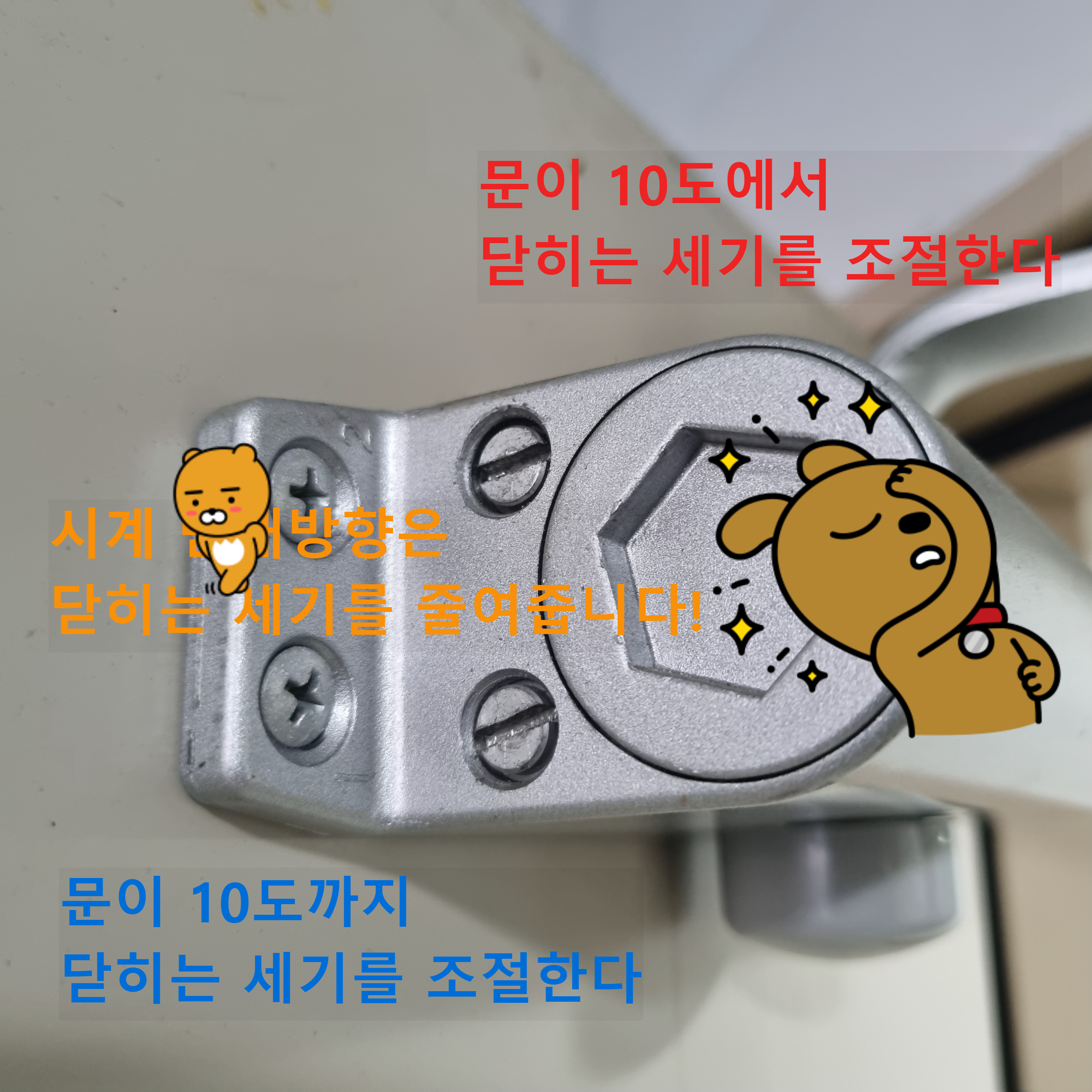 스티커 그림처럼 시계 방향으로 나사를 돌리면 문이 닫히는 세기가 줄어듭니다.