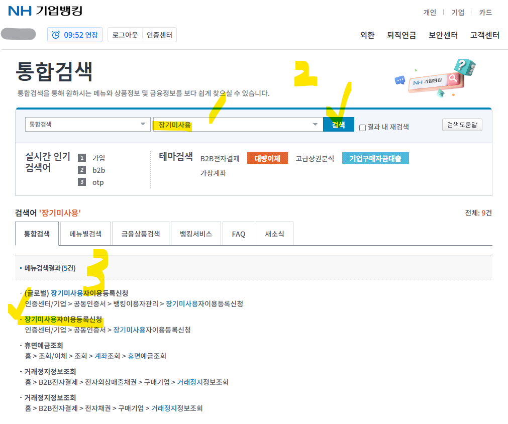- 검색에서 '장기미사용' 입력한 후 검색해서 밑의 그림처럼 '장기미사용자이용등록신청' 누릅니다.